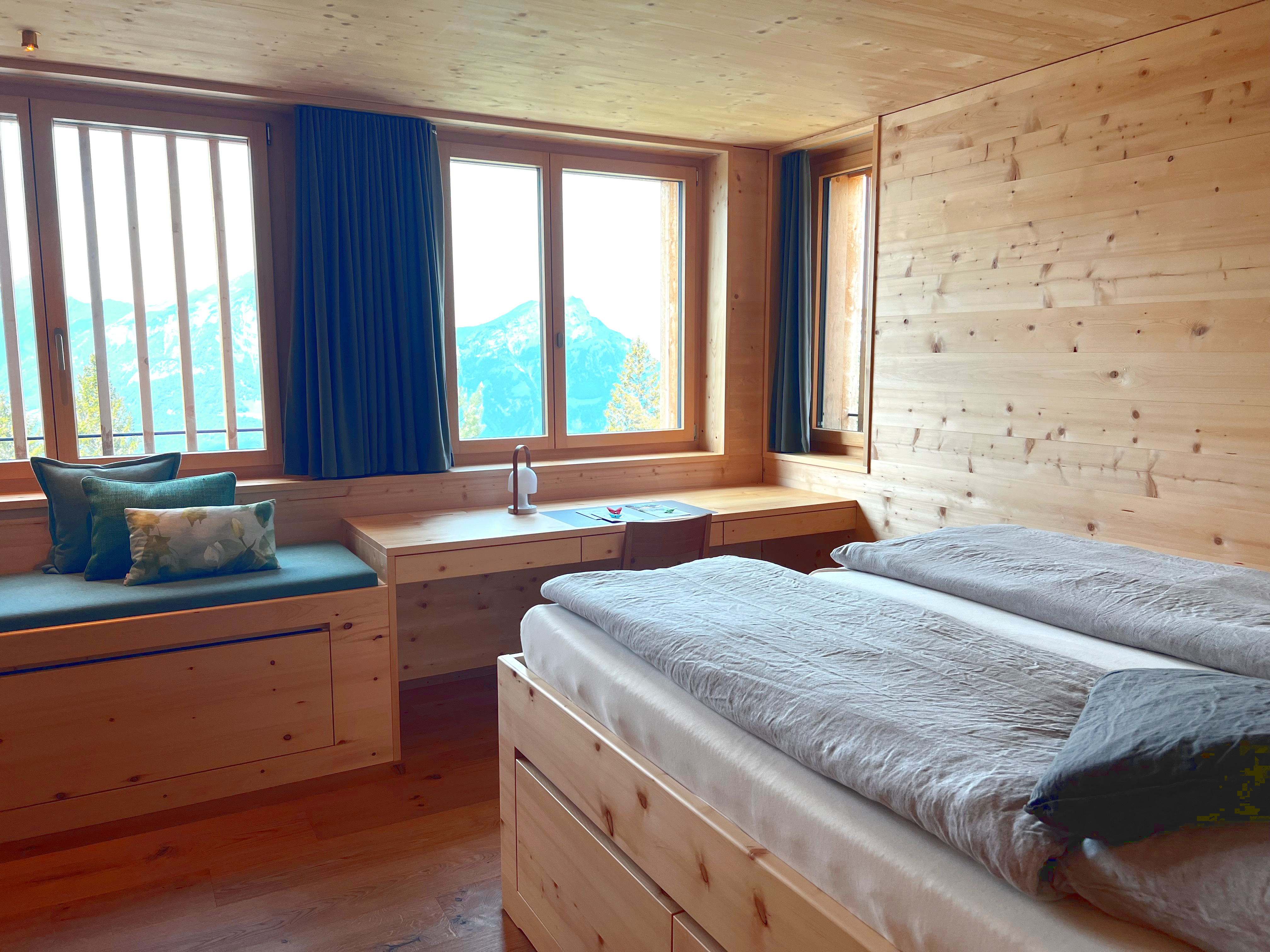 Die Zimmer sind bewusst schlicht, funktional und trotzdem gemütlich eingerichtet. Beim Bau und der Ausstattung wurde mit den besten natürlichen Materialien gearbeitet. So wurden die Wände und Möbel aus Mondholz gefertigt, das nachweislich über positive bautechnische Eigenschaften verfügt und zu einer strahlungsarmen Umgebung beiträgt. Für den erholsamen Schlafkomfort sorgen unsere speziell angefertigten Betten. Alle Betten sind mit den Bettsystemen des Schweizer Herstellers Leibundgut ausgestattet. Das weltweit einzige Bett mit automatischer Formanpassung an jede Körperform und Schlaflage bietet perfekten Schlafkomfort und garantiert beste Erholung.